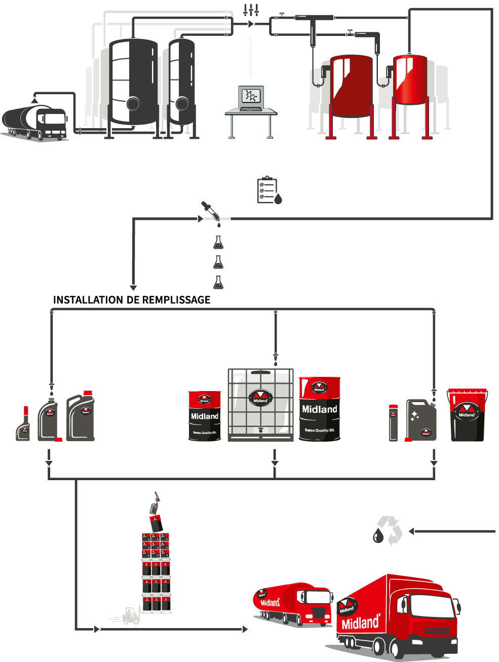 Pour fabriquer des lubrifiants, des additifs (voir Quel est le bénéfice des additifs pour l'huile ?) sont mélangés à des huiles de base. Les lubrifiants Midland sont fabriqués uniquement avec des additifs technologiquement testés et des huiles de base de la meilleure qualité. Néanmoins, chaque production de lubrifiants Midland est soumise à des tests rigoureux afin de garantir leur efficacité et leur résistance. Ces tests assurent non seulement le respect des normes internationales, mais garantissent également que les clients reçoivent toujours des produits de la meilleure qualité.
